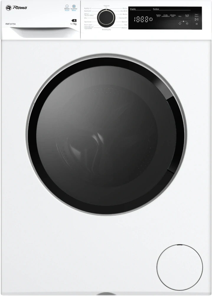 Představujeme pračku Romo RWF2475A – efektivní, tichou a elegantní v bílém provedení s kontrastním černým displejem. Tato pračka nabízí kapacitu pro 7 kg prádla a díky bezkartáčovému motoru je nejen energeticky úsporná, ale také mimořádně tichá. S širokou škálou programů a funkcí, jako je parní praní a odložený start, přináší do vaší domácnosti pohodlí a spolehlivost.