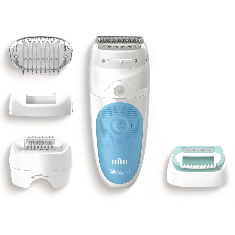 Součástí balení: Silk-épil 5 blue, holicí hlava a zastřihovací nástavec, nástavec s masážními válečky, nástavec pro kontakt s pokožkou,